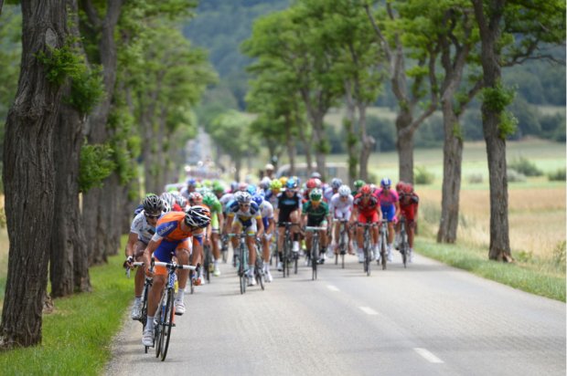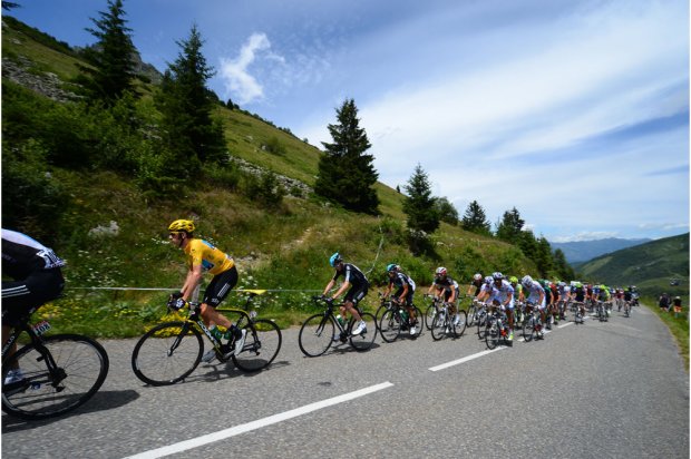 Les journées se suivent et se ressemblent pour Bradley Wiggins (Sky) et toute sa bande. Dans la dernière difficulté, on a cru apercevoir un semblant de rébellion emmené par Evans (BMC) et les Lotto mais les équipiers du maillot jaune sont vite revenus en tête de peloton. Dans la descente, une série de crevaisons dûe à des punaises sur l’asphalte (!) obligent de nombreux coureurs à changer de machines, dont Evans et Wiggins. Heureusement tout rentrera dans l’ordre en bas de la descente !