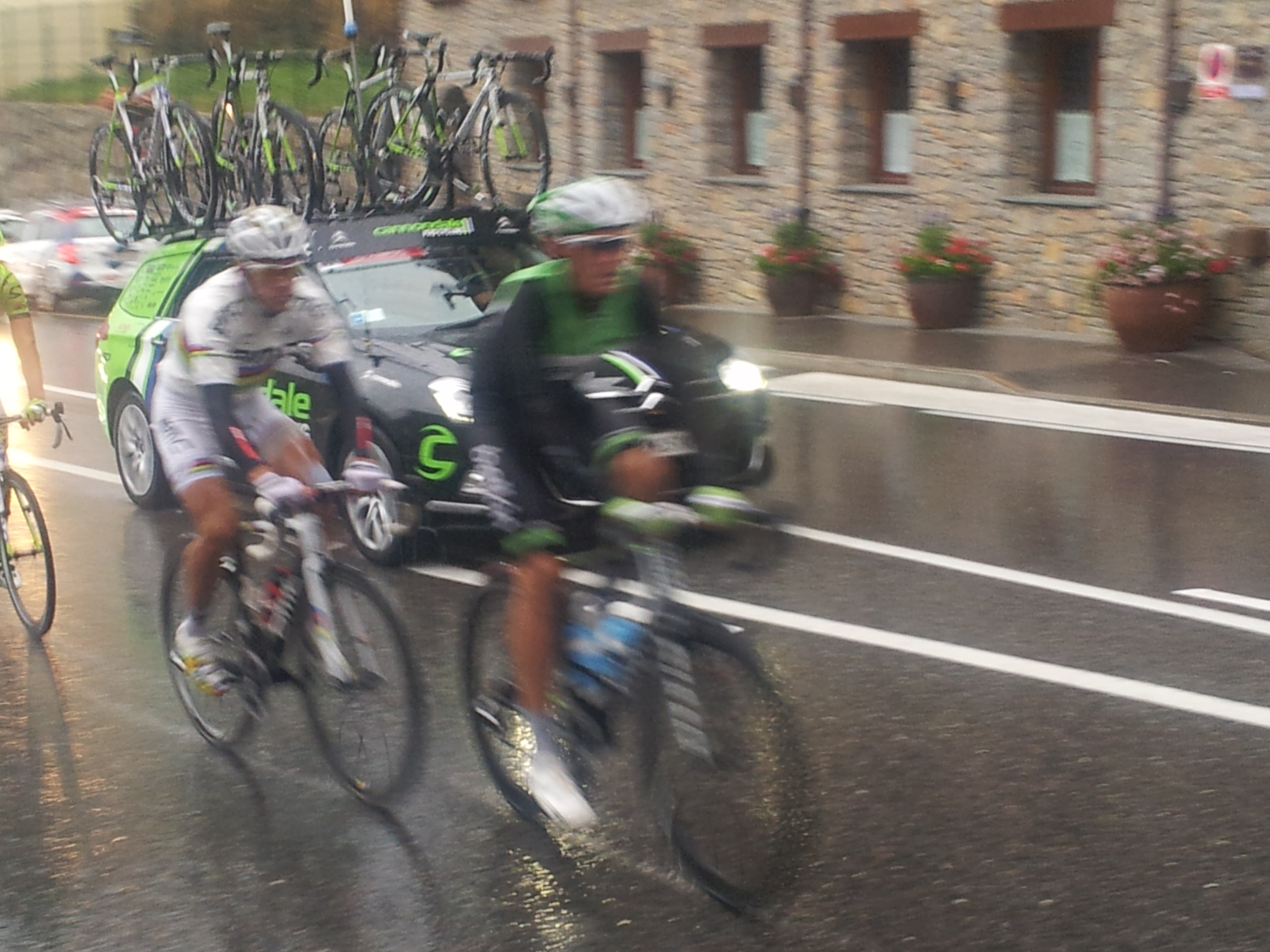 C’était une étape dantesque. La pluie, le froid (cinq/six degrés en altitude), le brouillard… Une journée d’hiver quoi. Mais ça n’a pas empêché Philippe Gilbert de s’échapper en compagnie de quatre autres coureurs : Steve Chainel (Ag2r La Mondiale), Graeme Brown (Belkin), Luis-Leon Sanchez (Belkin) et Daniele Ratto (Cannondale). Sur la photo, c’est l’Australien Brown que l’on voit en compagnie du Belge. Son équipier Espagnol, après avoir chuté dans la descente du Port d’Envalira, a abandonné victime d’hypothermie. Pour terminer, l’Italien a mis un Ratto aux favoris puisqu’il les a privé d’une victoire d’étape. En effet, c’est lui qui s’est imposé au sommet de la Collada de la Gallina.