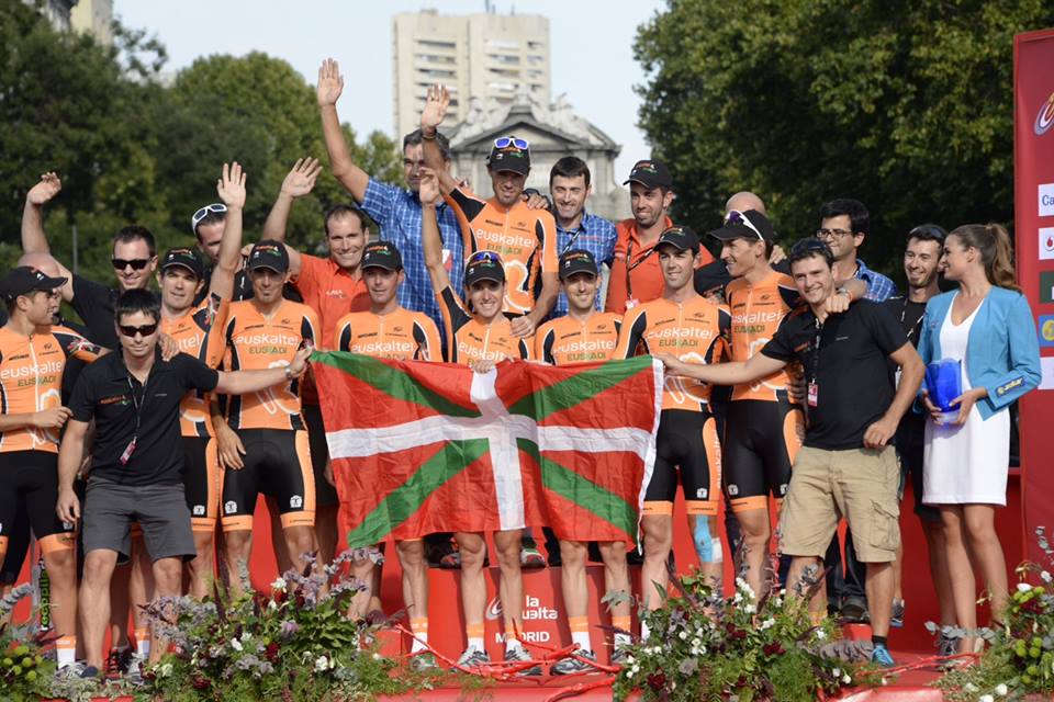 Même si l’annonce du rachat de la formation Basque, par Fernando Alonso, a fait le plus grand bien et son petit effet dans le monde cycliste, cette Vuelta 2013 restera tout de même le dernier Grand Tour pour ce sponsor historique, présent depuis une vingtaine d’années dans les pelotons professionnels. Au départ de Vilanova de Arousa, l’objectif était clair pour les hommes d’Igor Gonzalez de Galdeano : décrocher au moins une place sur le podium à Madrid et/ou glaner une petite victoire d’étape. En alignant ses trois grands leaders, Samuel Sanchez, Igor Anton et Mikel Nieve, l’équipe orange s’assurait peut être une bonne perf’. Hélas, aucun succès d’étape n’a été décroché et aucun coureur n’a pu se hisser dans les cinq premiers du général final. Par contre, Euskaltel s’est imposé au classement par équipes. Histoire de terminer en beauté. Le team est donc monté sur le podium dans la capitale Espagnole, arborant fièrement le drapeau Basque. Dernier instantané des coureurs aux mythiques maillots orangés sur une épreuve majeure. Le champion Olympique de Pékin a déclaré qu’Euskaltel-Euskadi, en remportant le classement par équipes «quitte le cyclisme avec joie, mais il était inévitable de voir des larmes. Nous avons vécu des années fantastiques. Nous formons une famille». L’an prochain, Sanchez, Anton et Nieve reviendront peut être avec une tunique aux couleurs de Fiat, Santander ou Vodafone. L’équipe sera devenue Asturienne. Asturienne, aux racines Basques.