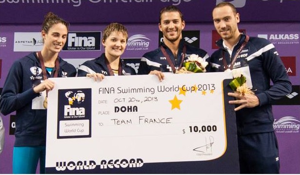 Après Eindhoven, Berlin, Moscou et Dubaï, cette nouvelle étape de la compétition en petit bassin se déroulait à Doha et cette fois-ci la France était bien là. Et cela dès le premier jour. En effet, le relais mixte français du 4×50 mètres 4 nages, composé de Mélanie Hénique, Anna Santamans, Giacomo Perez Dortona et Jérémy Stravius, signe le premier record du monde enregistré à Doha en 1:39.54 et nous rapportent une première médaille d’or. Ce même jour, Coralie Balmy, arrive troisième au 800 mètres nage libre et récolte donc le bronze. Un peu plus tard, Jérémy Stravius rapporte une nouvelle fois une médaille de bronze au 50 mètres papillon, derrière Roland Schoeman et Chad Le Clos (Afrique du Sud). Florent Manaudou décroche la seconde place et la médaille au 50 mètres brasse, derrière Schoeman encore une fois. Quatre médailles (une en or, une en argent, deux en bronze) en une journée, pas mal.