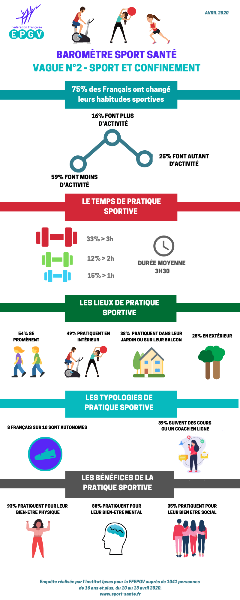 Depuis 9 ans, la Fédération Française d’Éducation Physique et de Gymnastique Volontaire, en collaboration avec l’institut IPSOS, mène son baromètre sport santé qui étudie les comportements des Français vis-à-vis de la pratique sportive. Fédération référente sur le sport santé, reconnue d’utilité publique, la FFEPGV s’est penchée sur l’impact du Covid-19 sur la pratique des Français. Durant le confinement, deux tiers des citoyens pratiquent une activité au moins une fois par semaine. 75% ont déjà changé leurs habitudes.